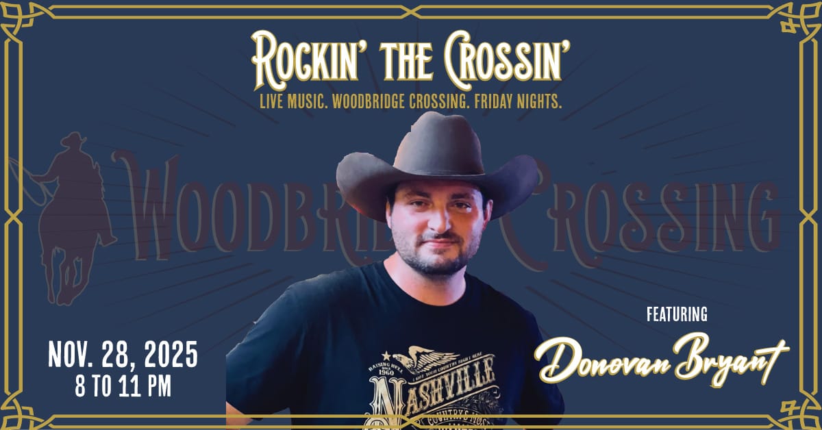 Kick off your weekend with the smooth, soulful sounds of Donovan Bryant, live inside Woodbridge Crossing. From classic country to heartfelt originals, Donovan’s voice fills the room with the kind of energy that pairs perfectly with a great steak and a glass of something strong.